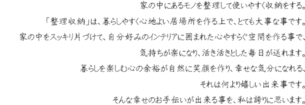 ◇応募資格・ハウスキーピング協会の整理収納アドバイザー2級をお持ちの方 ・整理収納の仕事経験は問いません。・年齢不問 女性の方限定・可能な限りご自身の車で移動が出来る方