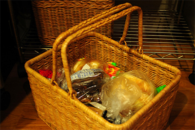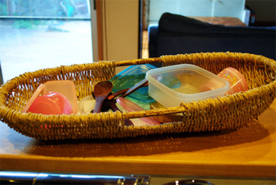 普段はパンやおやつを入れる収納カゴとして使い、お弁当を作った時は、持ち運びカゴとして。
